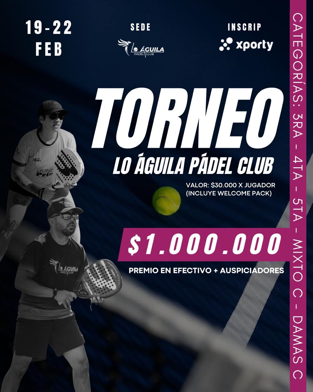 VEN A DISFRUTAR DE NUESTRO 4TO TORNEO DE PADEL TE ESPERAMOS FECHA: 19 AL 22 DE FEBRERO LUGAR: LO AGUILA PADEL CLUB CURACAVI PRECIO: $60.00...