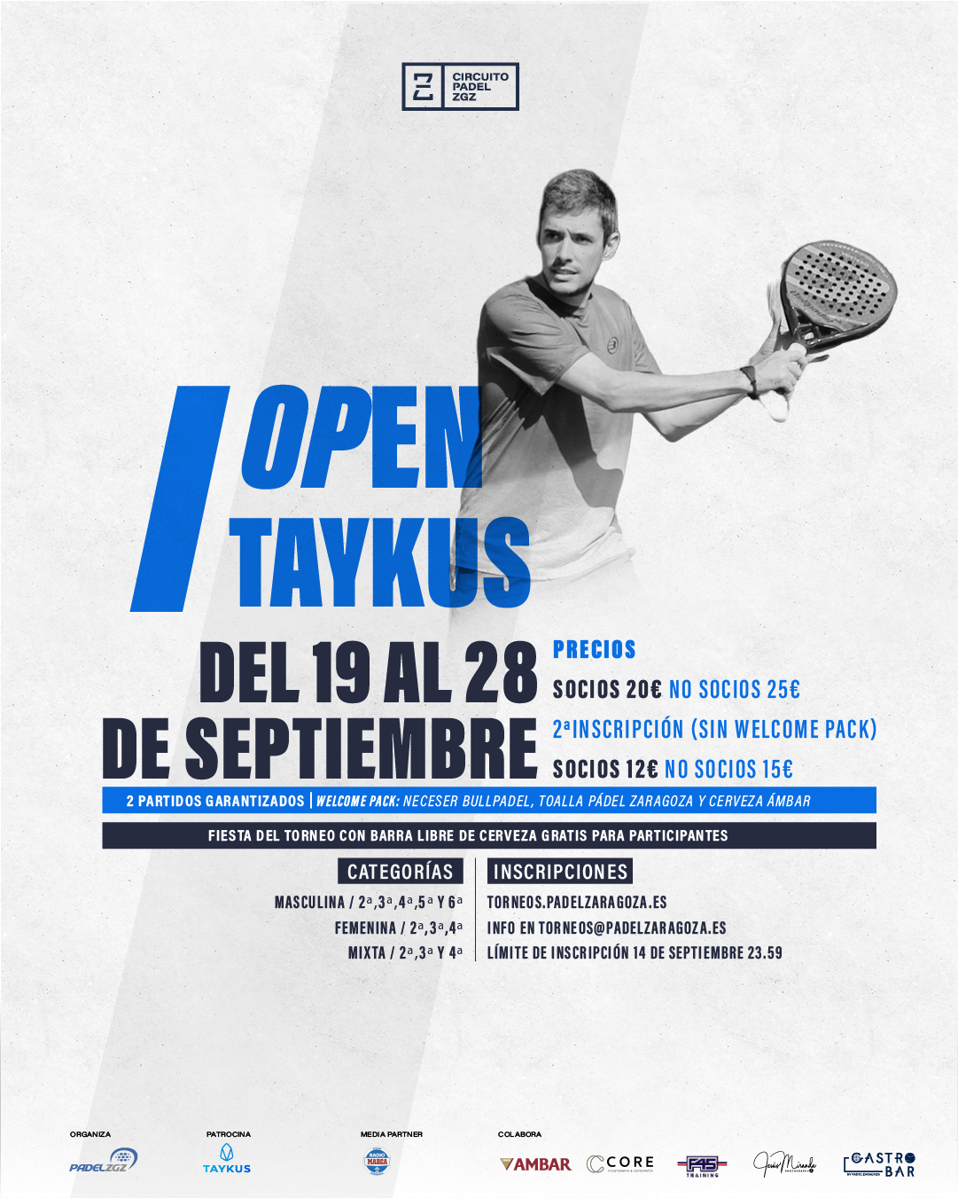 Fechas: del 19/09 al 28/09 (todas las finales ese domingo por la tarde). Welcome Pack: Néceser bullpadel, cerveza Ámbar y toalla Pádel Zaragoza S...