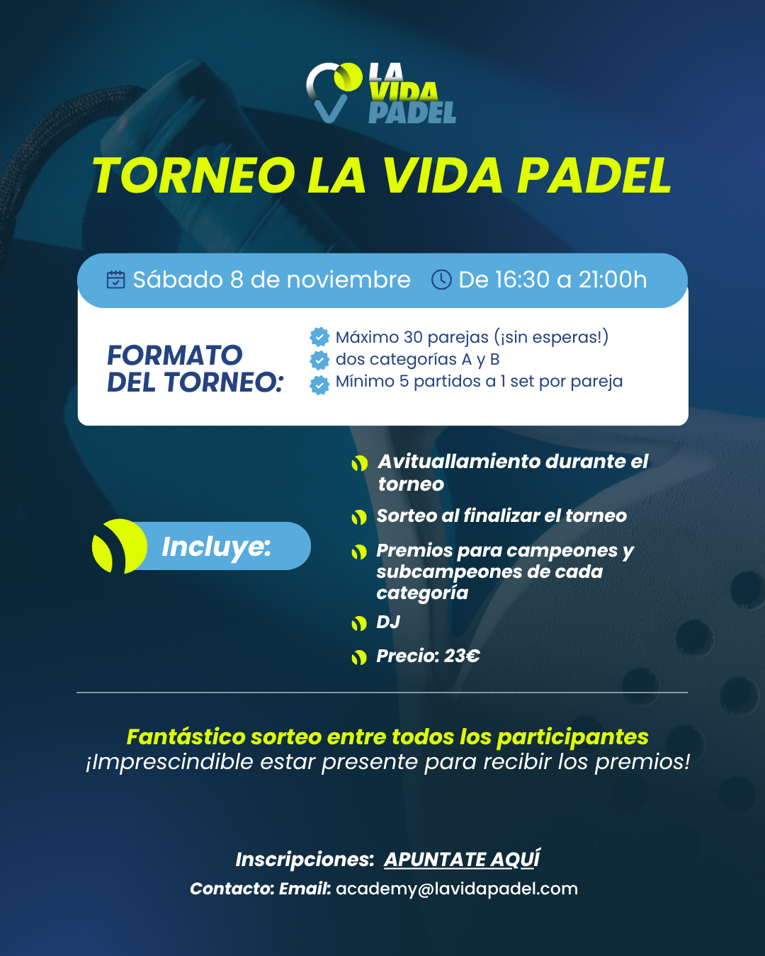 Torneo La Vida Padel. MASCULINO: Dos categorías A Y B. HORA COMIENZO: 16:30. Avituallamiento durante el torneo. Premios para campeones y subcam...