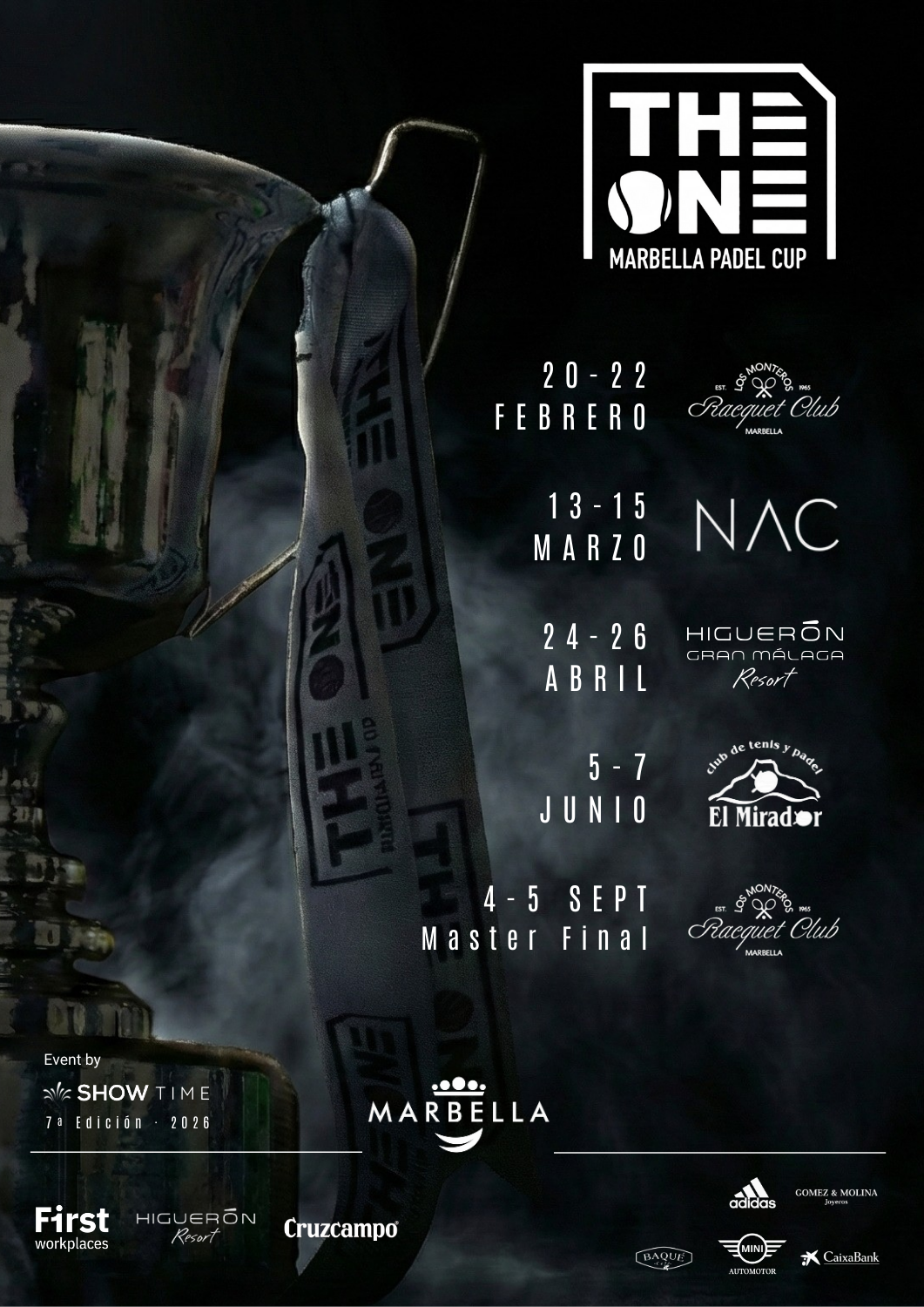 4 SEDES acogerán la 7ª Edición de THE ONE MARBELLA PADEL CUP más el MASTER FINAL que se celebrará en Los Monteros Racket Club el 4-5 De Septiembre de 2026, las pruebas serán las siguientes: